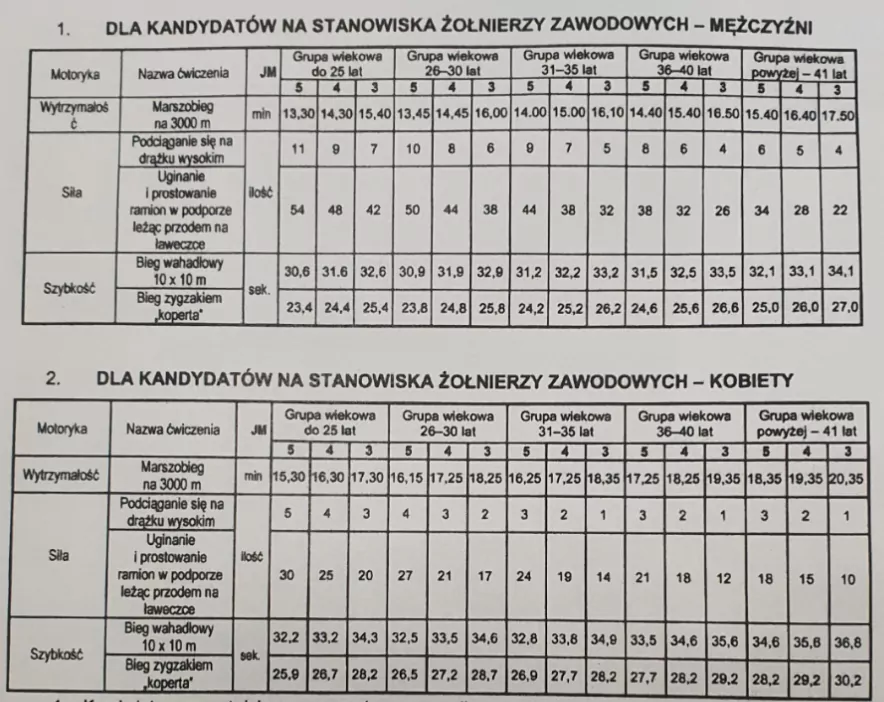Testy sprawnościowe dla kandydatów do Wojska Polskiego mają na celu ocenę ogólnej kondycji fizycznej, siły, wytrzymałości oraz koordynacji ruchowej. Zakres prób i wymagania różnią się w zależności od płci, wieku oraz rodzaju jednostki wojskowej. Niżej znajdziesz aktualny zestaw testów obowiązujących przy naborze do zawodowej służby wojskowej, zgodnie z obowiązującymi normami Ministerstwa Obrony Narodowej. Na stronie MON znajdziesz aktualne wytyczne: https://www.wojsko-polskie.pl/